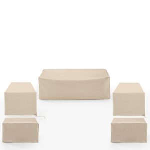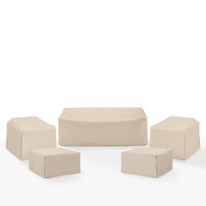 Give shelter to your patio furniture with this 5pc universal protective outdoor cover set. Sewn from polyester reinforced with heavy-duty vinyl, these outdoor furniture covers are ready to face the elements, including snow, dirt, sap, rain, and more. Tighten the sewn-in drawstrings and maintain your outdoor chair set’s beauty no matter the season. Designed to fit a variety of outdoor rocking chairs, patio chairs, end tables, and square outdoor ottomans.