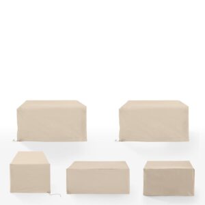 Give shelter to your patio furniture set with this 5pc universal protective outdoor cover set. Sewn from polyester reinforced with heavy-duty vinyl, these outdoor furniture covers are ready to face the elements. Tighten the sewn-in drawstrings and maintain the beauty of your patio table and outdoor chairs, no matter the season. Designed to fit a variety of patio dining chairs and round dining tables.