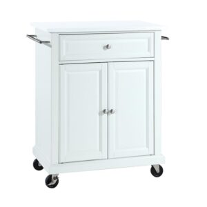 Save space while adding mobile storage with the Compact Kitchen Cart. Featuring a large cabinet with an adjustable shelf, this rolling cart easily stores pots, pans, or small appliances. Two towel bars and a large storage drawer are perfect for keeping dishtowels and utensils close at hand. With a beautiful stainless steel countertop, plus heavy-duty casters for mobility, this small kitchen island on wheels is a welcome addition to your kitchen space.