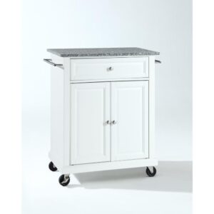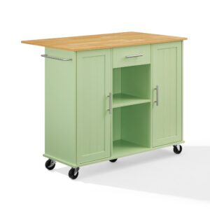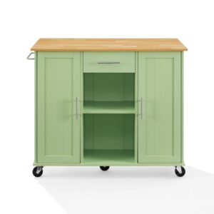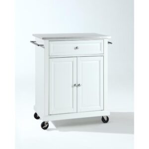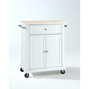 Save space while adding mobile storage with the Compact Kitchen Cart. Featuring a large cabinet with an adjustable shelf, this rolling cart easily stores pots, pans, or small appliances. Two towel bars and a large storage drawer are perfect for keeping dishtowels and utensils close at hand. With a beautiful wood countertop, plus heavy-duty casters for mobility, this small kitchen island on wheels is a welcome addition to your kitchen space.