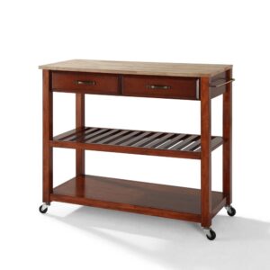 TRADITIONAL CHARM: This kitchen cart features a black base and a solid wood top with a natural finish. The genuine metal hardware in brushed nickel and beautiful raised panel doors pair well with modern farmhouse decor.