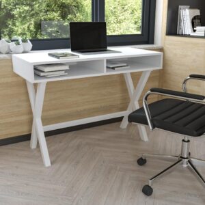 Make your corner computer desk work as hard as you do. This desk delivers style and functionality from top to bottom starting with its spacious desktop in a smooth white finish. Sawhorse-style legs in metal are put to work as supports for 2 open shelves that can be used to display books small storage boxes or other items. This unique L-shaped writing desks’ compact design and industrial style maximizes space and storage potential so that you can maximize productivity.