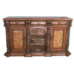 The Juliana Buffet is a large and impressive cabinet from Peru and part of our new Juliana Series. This cabinet stands a magnificent 80.00 Long x 14.50 Depth x 45.00 Inches Tall. This series boasts a Spanish influence with large scaled details and its multi layered finish of light and dark sienna and brown tones with subtle natural contrasts resulting from hand rubbing and exposing the rich wood undertones then delicately detailed with hand painted soft scrolls. The Buffet/ Sideboard is a perfect addition from the Juliana series, a complete collection offering a spectacular dining table, Bench and Buffet options. The Juliana series is a collection from our Santa Lucia Collection which consists of handmade, hand painted, and distressed solid wood furniture making each piece a timeless investment. Hand crafted treasures made one piece at a time, under one roof, by our exclusive family owned manufacturer from Lima, Peru. Their master artisans are skilled in furniture making techniques influenced by the Spanish during the colonization of Peru. Many items in the diverse collection feature specialty hand painted finishes that have also been passed on and perfected from generation to generation. The family strives to be environmentally friendly by using woods re-purposed from haciendas and old colonial homes as well as wood indigenous to South American forests, primarily mahogany, cedar, mean and requiem. If you are a lover of beautiful painted furniture, find hill country rustic romantic, or find richness in Mediterranean lore Then you too may fall in furniture love with this fine collection.