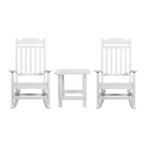 Everything you need for a relaxing night on the deck, patio, or in the backyard is yours with this set of 2 commercial grade Adirondack rocking chairs with matching side table. Designed for indoor or outdoor use and lending a casual sophistication to any environment, this 3 piece seating set is ideal on the front porch and in your sunroom. The rockers allow you to rest and relax while the side table holds your belongings or decor and pulls your look together. Longevity and durability are important hallmarks for quality furniture and this patio set is up to the task. Constructed from polystyrene, this table and 2 chair set is more durable than plastic and won’t chip, splinter or peel but is lightweight and easily portable. Metal screws securely join all pieces allowing the chairs to hold up to 350 lbs. static weight and the table holds up to 200 lbs. static weight capacity. UV treated, weather and stain resistant, and easily cleaned this poly resin patio furniture set is perfect for any living space. Assembly takes less than 30 minutes per piece for your convenience.