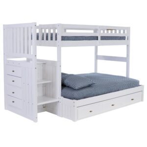 This ready-to-assemble unit in a fashionable light ash finish features a twin over full bunk bed with a three-drawer under-bed storage unit. The drawers feature metal guides and attractive chrome pulls. Quality and solid wood construction makes this bed a great buy.